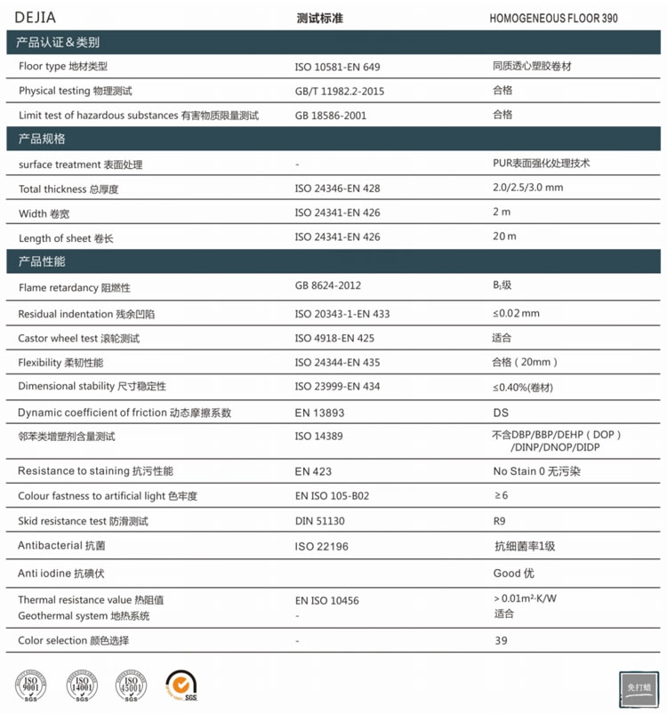 健康安全的環境 得嘉秉承健康、安全、環保的理念,得嘉不斷優化和改進塑膠卷材原材料配方,產品采用環保型非鄰苯類增塑劑,確保給使用者提供一個健康安全的環境。